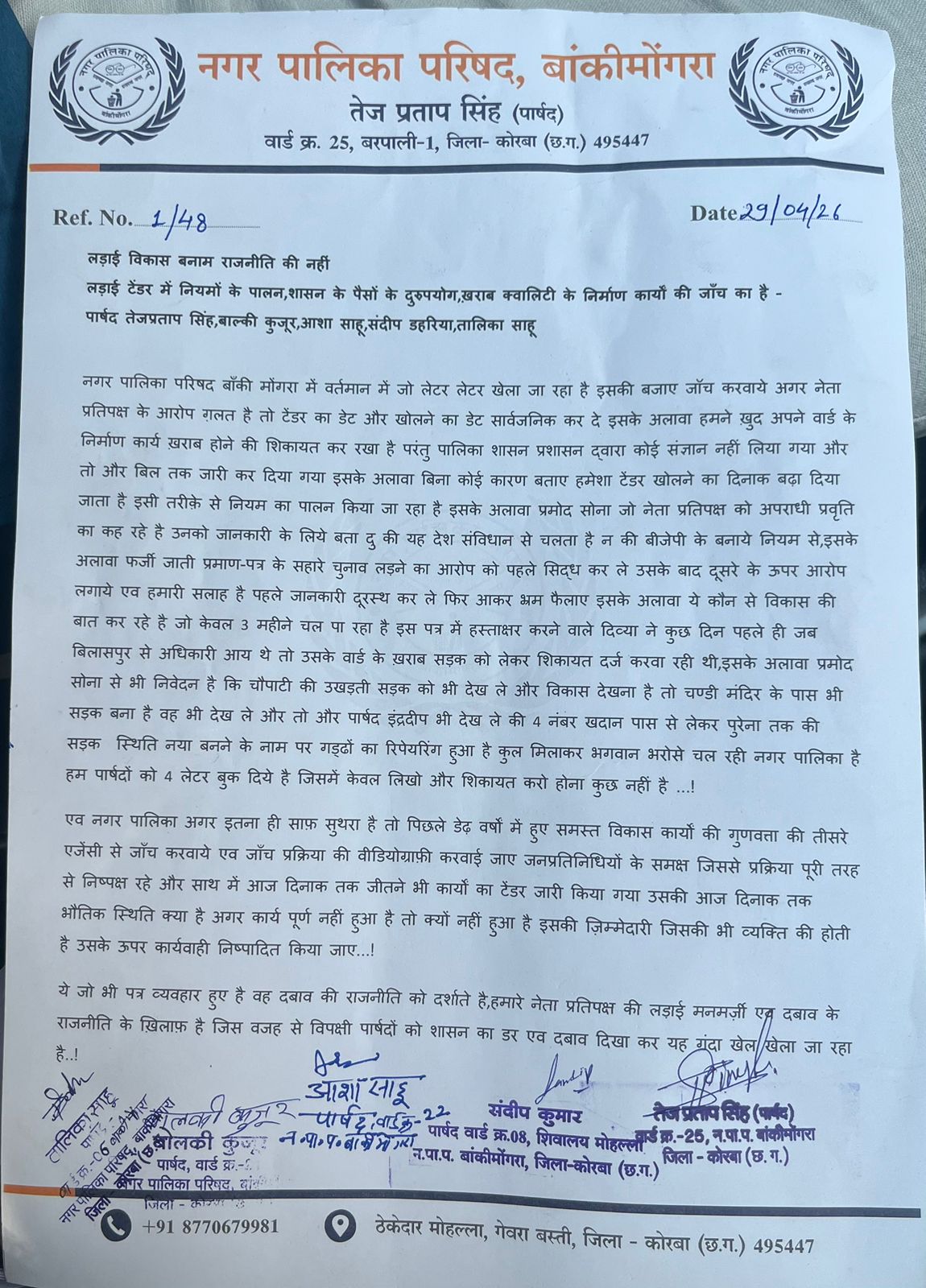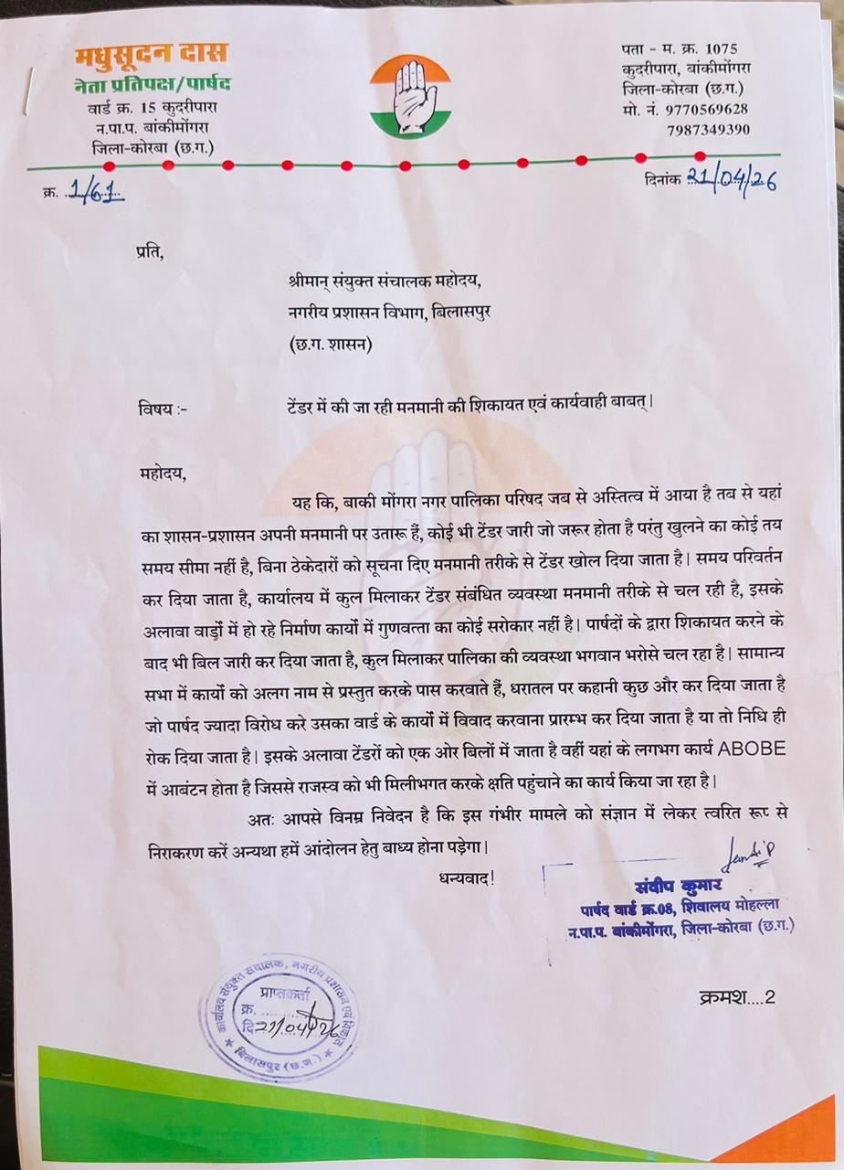 नगर पालिका परिषद बाँकी मोंगरा की कार्यप्रणाली चल रहा भगवान भरोसे..!संयुक्त संचालक,बिलासपुर को कार्यवाही की माँग को लेकर विपक्षी पार्षदों ने सौपा ज्ञापन…!