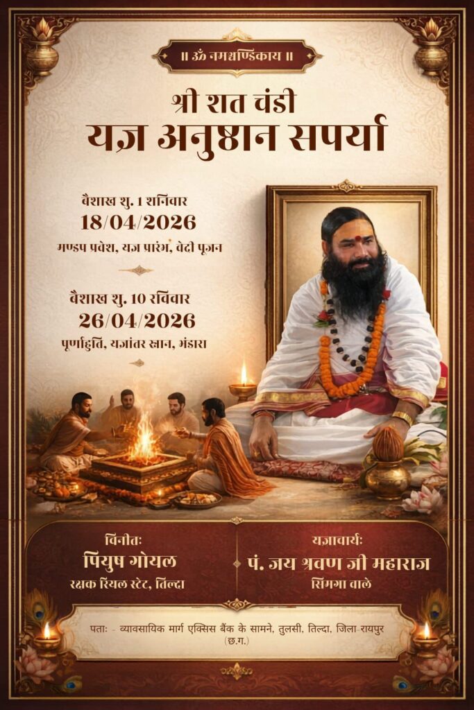 रायपुर जिले के तिल्दा-नेवरा अंतर्गत ग्राम पंचायत तुलसी में 26 अप्रैल 2026 (रविवार) को भव्य महाभंडारा समारोह का आयोजन किया जा रहा है। वैशाख शुक्ल दशमी के पावन अवसर पर आयोजित इस धार्मिक कार्यक्रम को लेकर क्षेत्र में भारी उत्साह देखने को मिल रहा है। आयोजकों के मुताबिक, आसपास के गांवों सहित बड़ी संख्या में श्रद्धालुओं के पहुंचने की संभावना है।समारोह की शुरुआत वैदिक विधि-विधान के साथ ‘पूर्णाहुति’ से होगी। इसके बाद दोपहर 12 बजे से महाभंडारा प्रारंभ होगा, जिसमें श्रद्धालुओं के लिए महाप्रसाद की विशेष व्यवस्था की गई है। इस धार्मिक अनुष्ठान का संचालन यज्ञाचार्य पंडित जय श्रवण महाराज (सिमगा) द्वारा किया जाएगा।कार्यक्रम का आयोजन कमर्शियल स्ट्रीट, एक्सिस बैंक के सामने, ग्राम तुलसी (तिल्दा), जिला रायपुर में किया जा रहा है। आयोजन स्थल पर श्रद्धालुओं के लिए बैठने, पेयजल और प्रसाद वितरण की समुचित व्यवस्था की गई है, ताकि सभी भक्तों को सुविधा मिल सके।आयोजक पीयूष गोयल (रक्षक रियल एस्टेट, तिल्दा) ने क्षेत्रवासियों से अधिक से अधिक संख्या में शामिल होकर धर्म लाभ लेने और महाप्रसाद ग्रहण करने की अपील की है। उन्होंने बताया कि यह आयोजन सामाजिक और धार्मिक एकता का प्रतीक है, जिसमें सभी वर्गों की भागीदारी महत्वपूर्ण है।महाभंडारा जैसे आयोजनों से न केवल धार्मिक आस्था को बल मिलता है, बल्कि समाज में आपसी भाईचारे और समरसता का संदेश भी फैलता है। तुलसी में होने जा रहा यह आयोजन भी इसी दिशा में एक सराहनीय पहल माना जा रहा है।