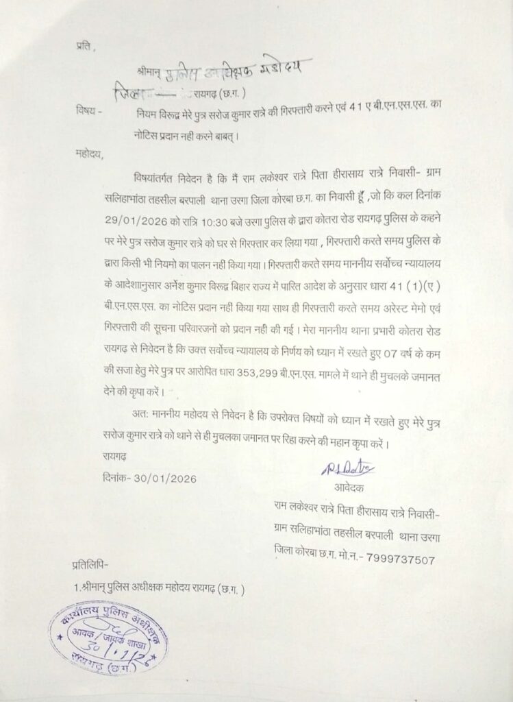 सरोज रात्रे के पिता ने पुलिस अधीक्षक को बताया बिना नोटिस और नियम विरुद्ध गिरफ्तारी !
